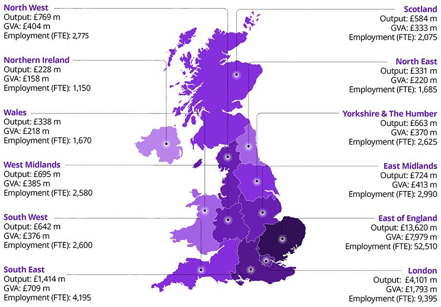 Not: Bölgelere göre ayrıştırılmış ve GSKD ve FTE istihdamı cinsinden sunulan bilgi alışverişi, eğitim ihracatı, işletme ve sermaye harcamaları ve turizm faaliyetlerinden kaynaklanan ekonomik etki. Bu kollar, Cambridge Üniversitesi’nin toplam 29.801 milyon sterlinlik etkisinin yaklaşık 24.108 milyon sterlinini (%81) oluşturmaktadır. Finansal tahminler 2020-21 fiyatlarıyla sunulur, net bugünkü değerleri (geçerli olduğunda) yansıtmak için iskonto edilir, en yakın 1 milyon sterline yuvarlanır ve belirtilen toplamları tam olarak karşılamayabilir. İstihdam tahminleri en yakın 5’e yuvarlanır ve yine tam olarak belirtilen toplamları toplamayabilir.
