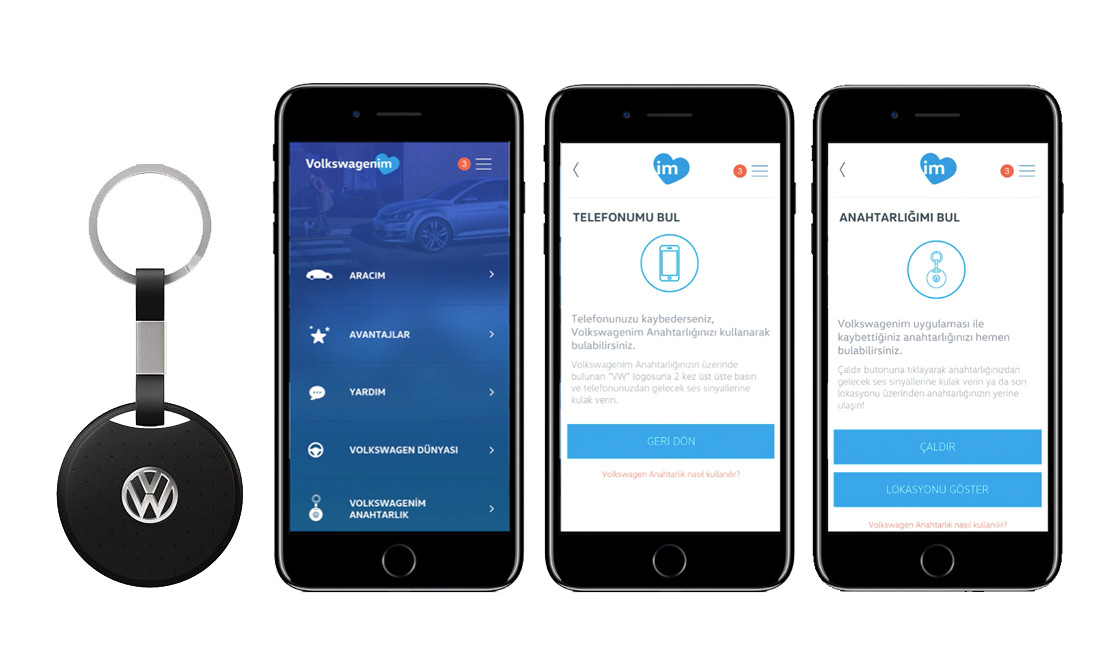 Volkswagen tarafından Volkwagenim mobil uygulamasına dahil edilen akıllı anahtarlık araç sahiplerine çok özel bir deneyim sunuyor. Kullanıcıların telefonları ile araba anahtarları arasında bir iletişim sağlayan akıllı anahtarlık, ikisinden biri kaybolduğunda özel alarmı ve lokasyon takibi sayesinde bulunmalarını kolaylaştıracak. Mobil uygulama içinden “Telefonumu Bul” veya duruma göre “Anahtarlığımı Bul” seçenekleri her zaman kullanıcıların kurtarıcısı olacak.